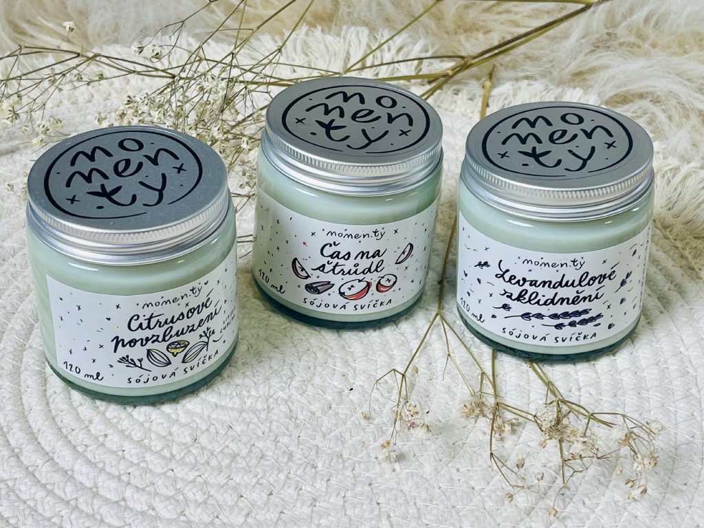 Svíčka z přírodního sójového vosku, s esenciálním olejem. Sójový vosk je přírodní produkt, hoření je proto čisté bez čmoudu. Sójová svíčka vydrží hořet mnohem déle než klasický parafín.